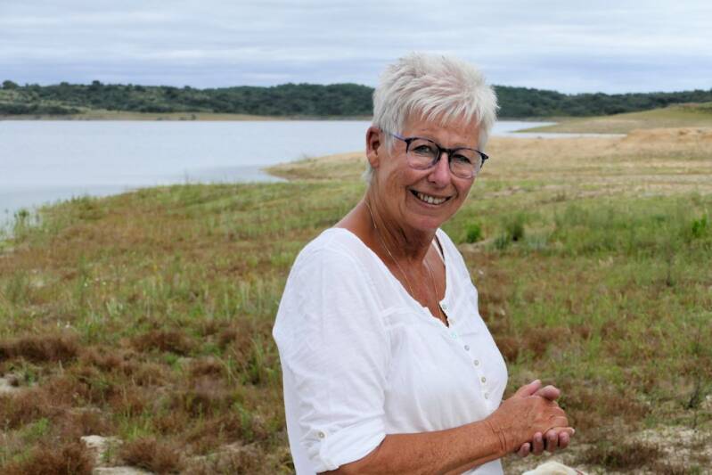 Floor verkent de omgeving en keurt het goed...Er staan nog 3 campers verspreid langs de oever van het meer