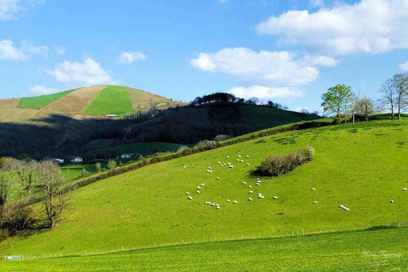 Het is Frans Baskenland het landschap is mooi tegen de Pyreneeën aan ..Veel schapen voor de kaas uit deze regio ,harde schapenkaas